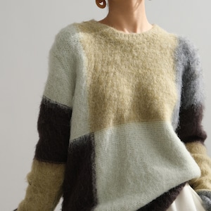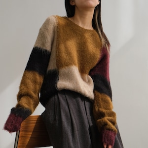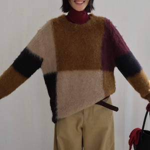 パッチワークデザインが目を引く、オーバーサイズニット。