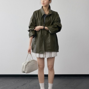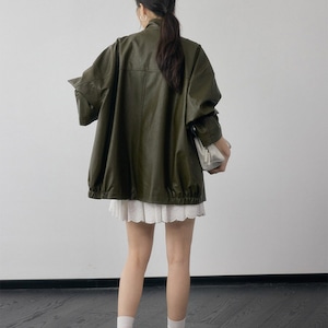すっきりとしたノーカラーで、洗練された印象のフェイクレザージャケット。