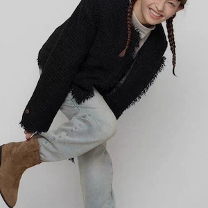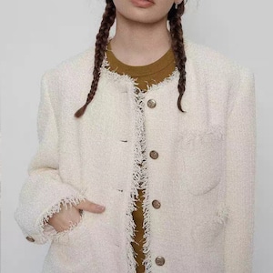 フリンジがアクセントになった、ノーカラージャケット。