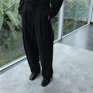 ワイドなシルエットながらも、裾に向かって緩やかに絞り込まれたデザインが特徴です。