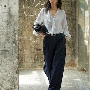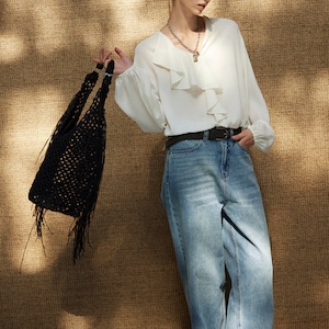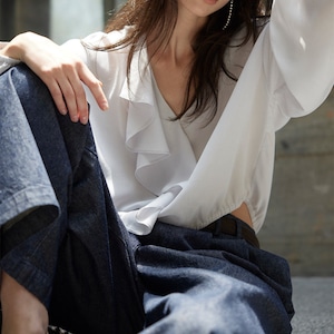 フリルがアクセントになった、着こなしを華やかにするブラウス。