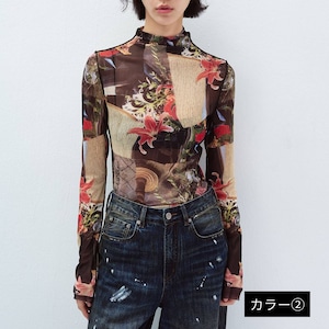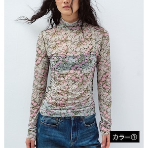 華やかなフラワープリントが目を引く、ハイネックカットソー。