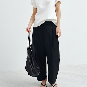 センタープレスが縦のラインを強調し、スタイルアップ効果のあるフルレングスパンツ。