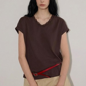 Vネックにあしらわれたレースが、さりげないアクセントになるTシャツ。